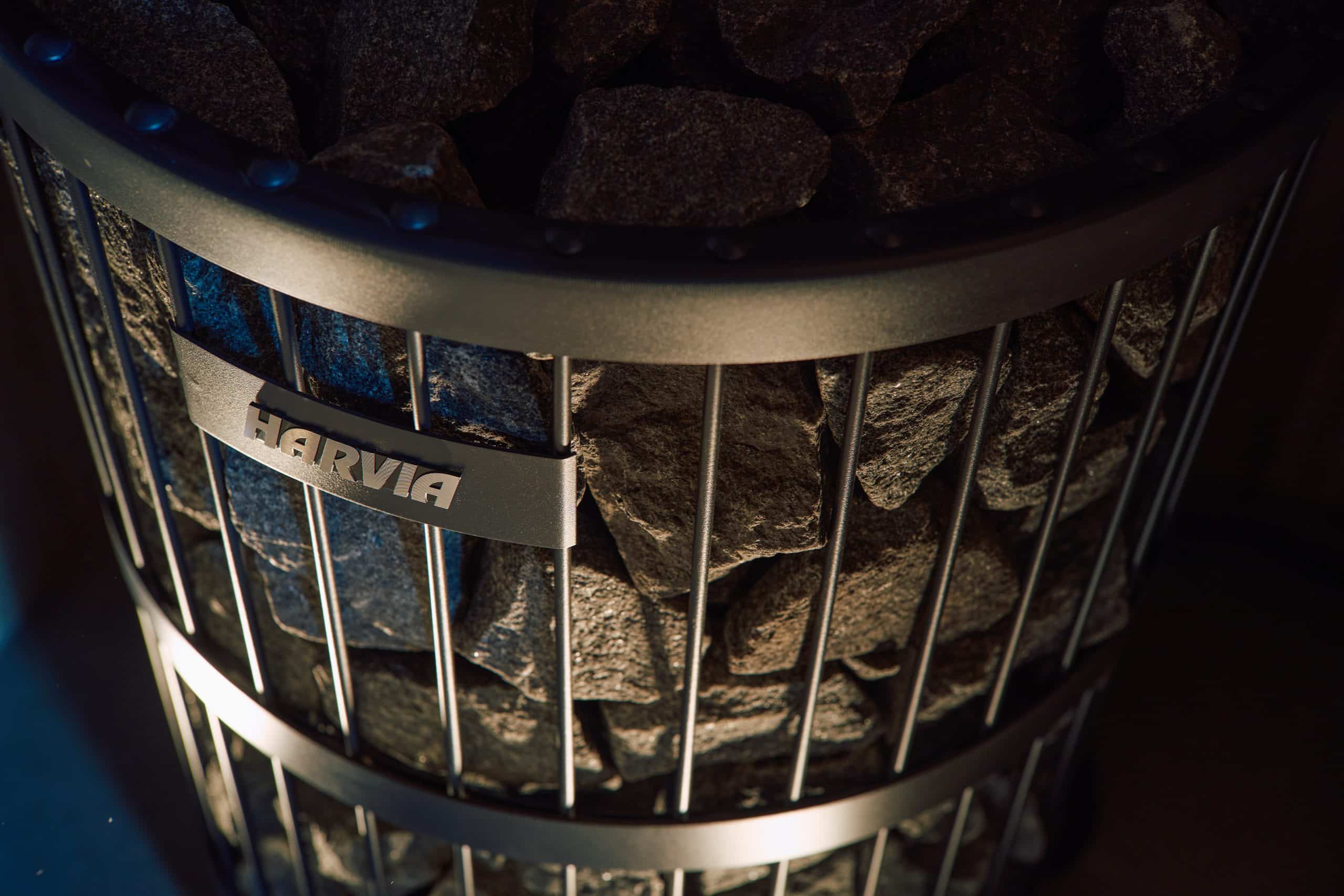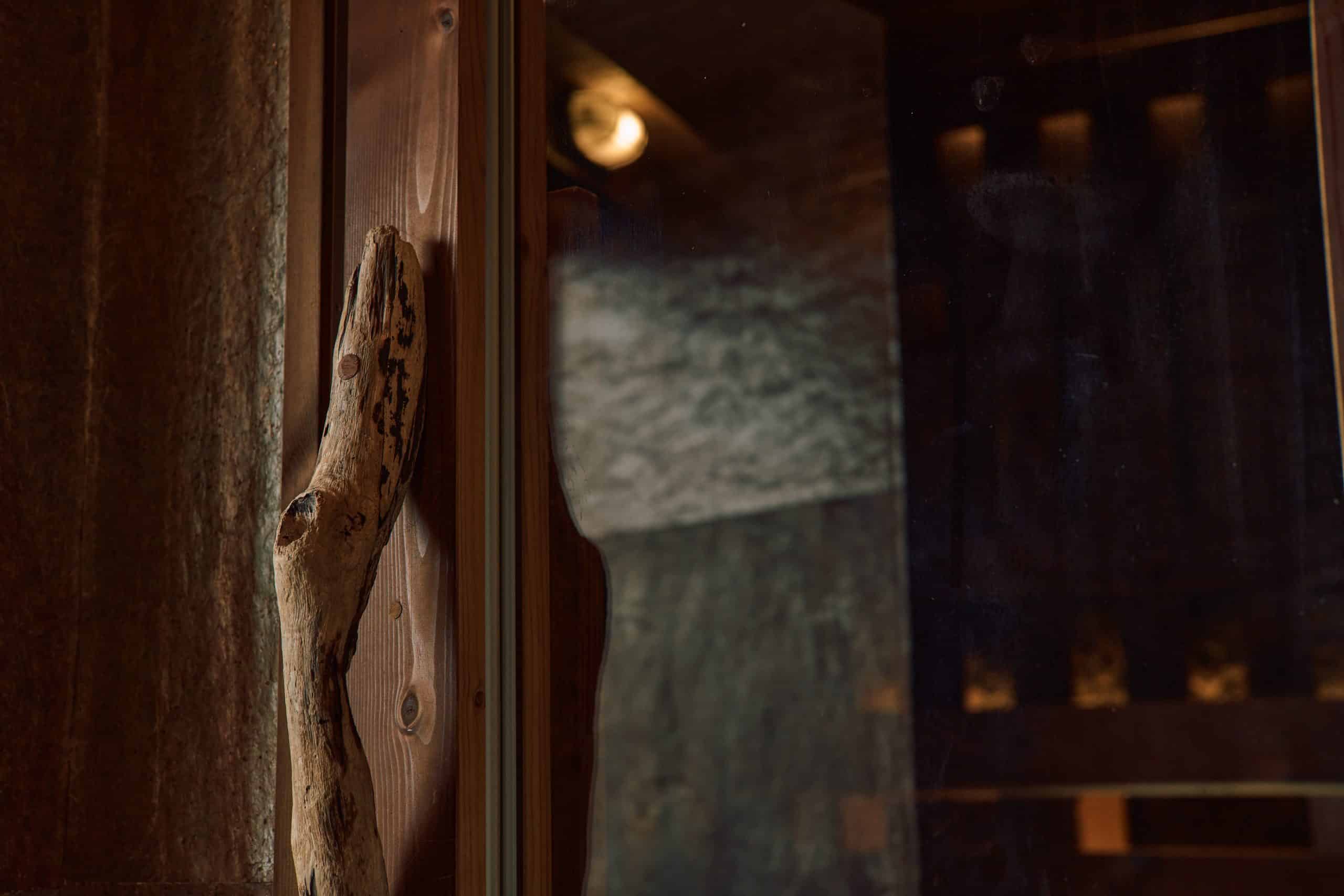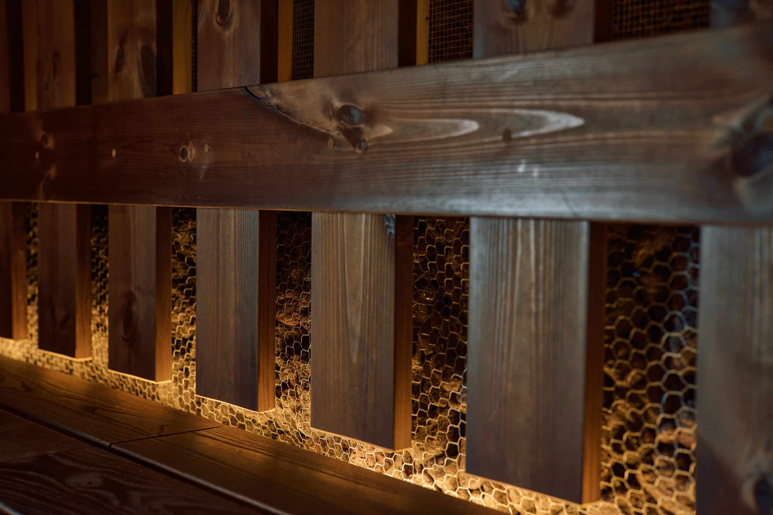 サウナは三原山の荒々しさを表現するために、壁面には噴火で発生した火山礫を使用し、元々ある天井の梁型にはHANDYSTONEを施工。
